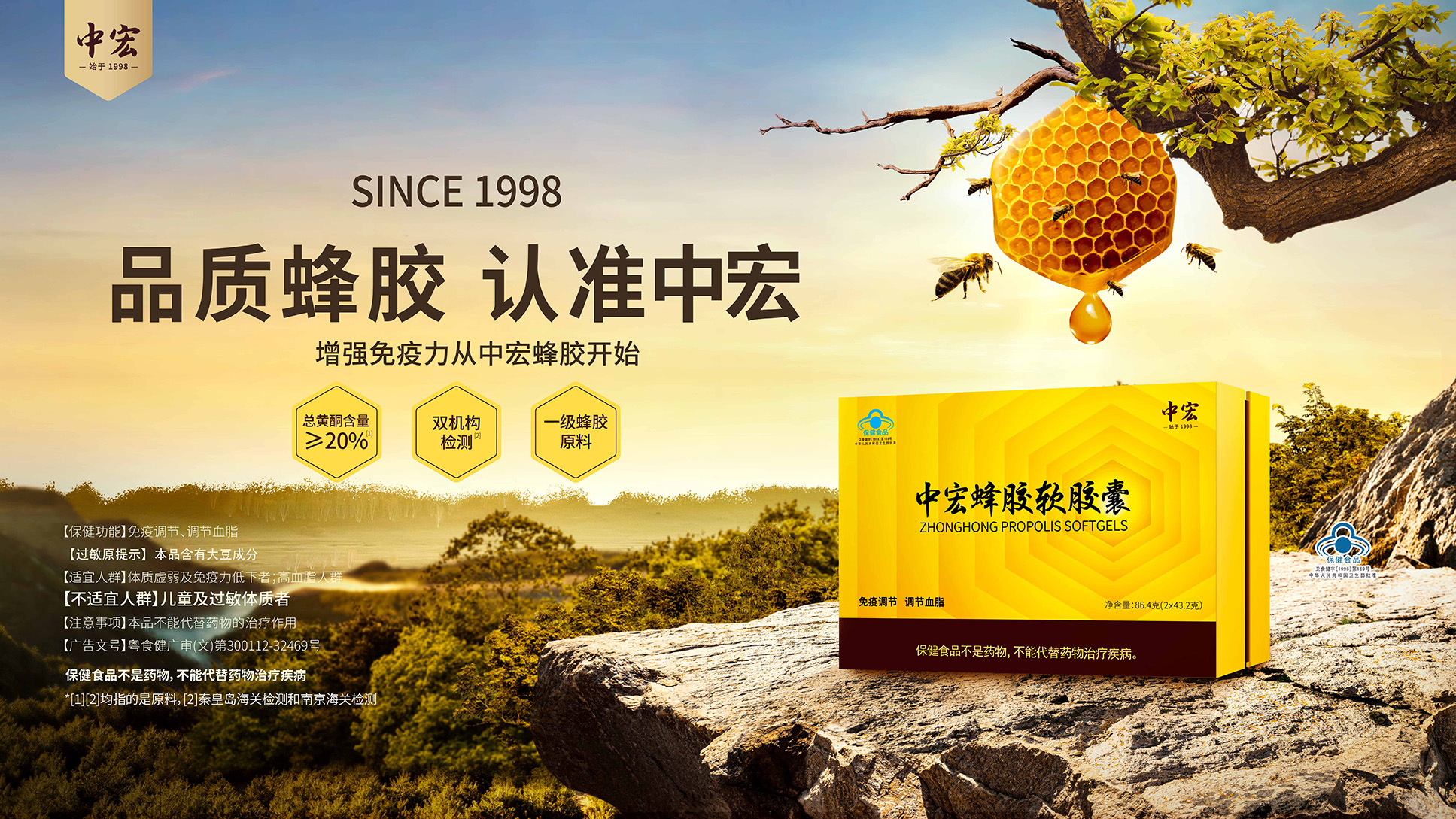 中宏品牌自1998年起,便專注深耕蜂膠產(chǎn)業(yè)。旗下?lián)碛幸苑洚a(chǎn)品為主的系列產(chǎn)品,如蜂膠軟膠囊、蜂王漿凍干粉等,產(chǎn)品線涵蓋調(diào)節(jié)免疫力、骨健康、缺氧耐受力提升、降三高(血糖、血脂、血壓)等多項功能。